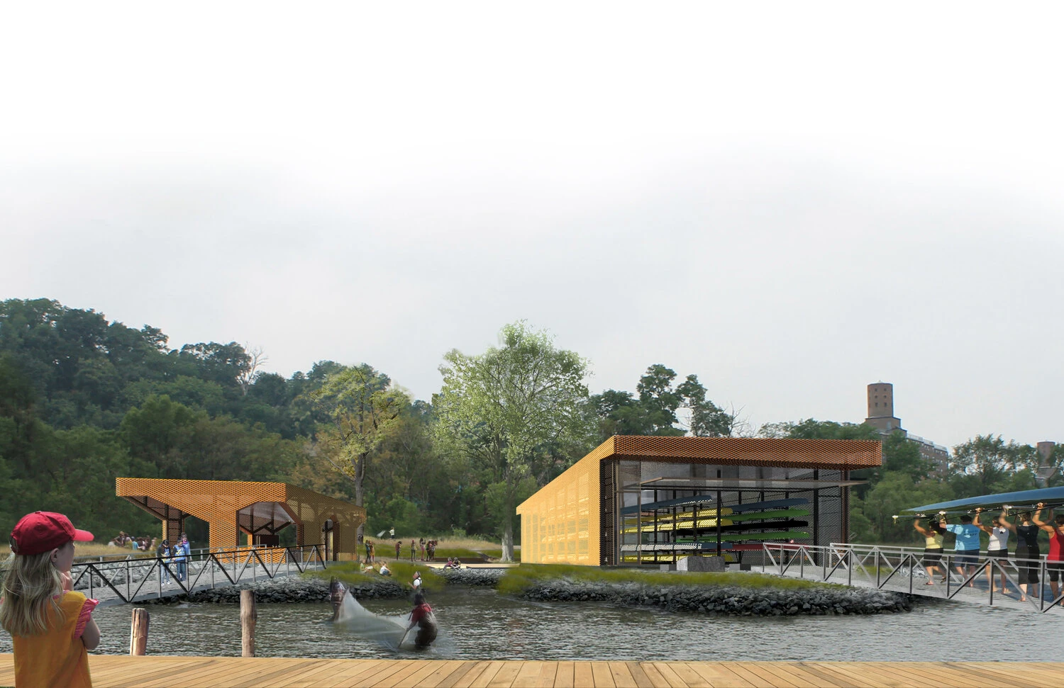 The buildings blur the line between shore and river, allowing water to enter the buildings during flood events and encouraging visitors to explore beyond the water’s edge. The boat storage and open classroom buildings’ design celebrates storm resilience, using prefabricated steel structural elements, concrete floors, and a metal skin of expanded weathering steel panels. This material allows water to flow freely in and out of the structures and weathers naturally to form a permanent protective patina. Two gangways leading to a floating dock create a protected ‘science cove,’ encouraging exploration of the site’s diverse ecology through seining, wildlife observation, and oyster gardening. The cove also provides for boating instruction protected from boat wakes and river turbulence.